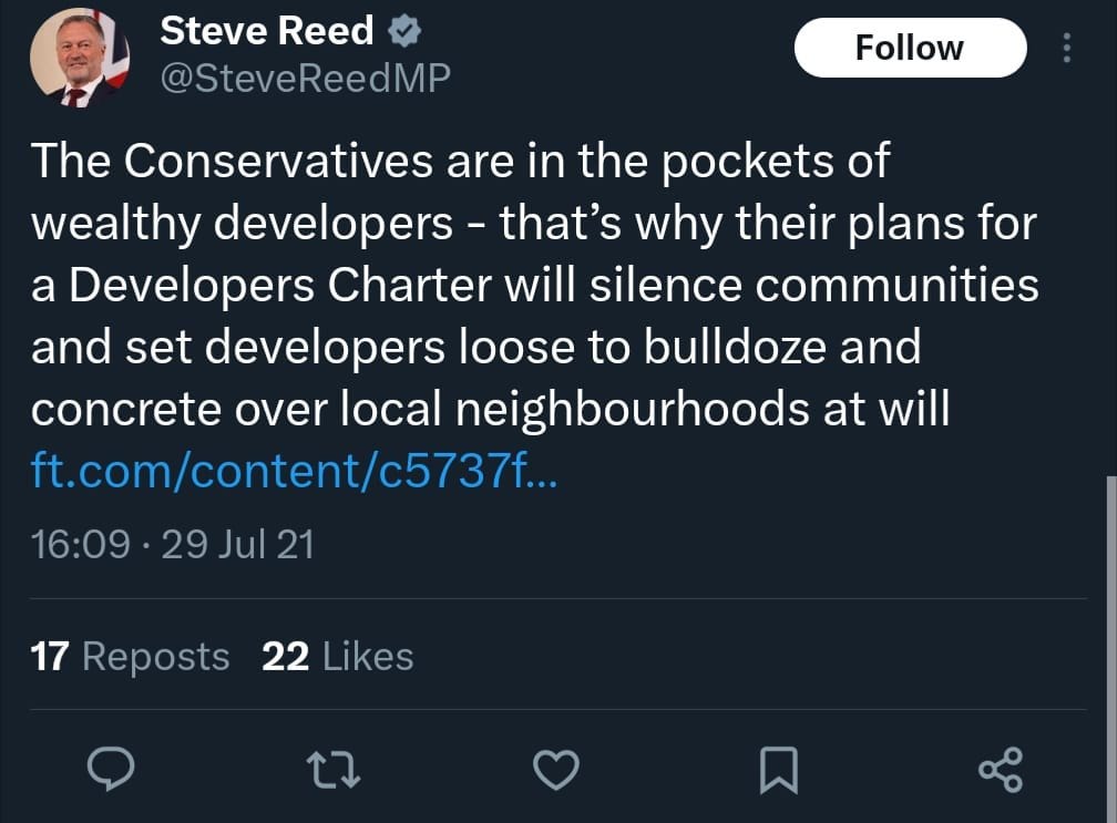 The negative take goes back to Reed’s time shadowing housing in the early 2019–24 Parliament, when he helped torpedo Boris Johnson’s planning reforms. Concern has centred on a now-deleted 2021 tweet accusing Johnson of pushing a “developer’s charter” that would gag local residents from objecting to applications.