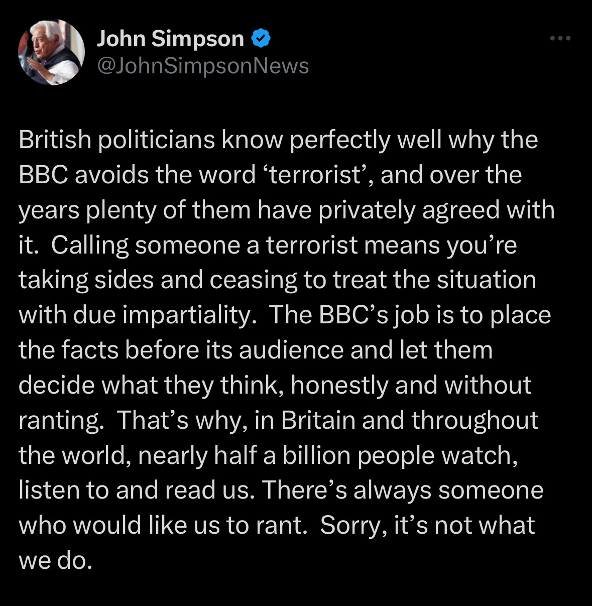 During my undergraduate degree I lost count of the number of times my university issued emails or statements expressing solidarity or organised vigils in the aftermath of disturbing international events. The response from Britain’s universities has been conspicuous by its absense. So too has the BBC shamed itself in its refusal to refer to Hamas as terrorists. The esteemed broadcaster John Simpson defended this in a tweet explaining that the beeb has to avoid taking sides. Forgive me, but bullshit. Did the BBC not describe 9/11 or 7/7 as terrorists attacks? Regardless, Hamas is a proscribed terrorist group in the UK and the BBC is the British Broadcasting Corporation.